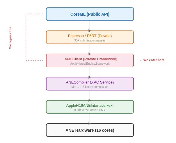 关键洞察:CoreML不是唯一的入口。AppleNeuralEngine.framework中的_ANEClient类提供了对编译→加载→评估流程的直接访问。CoreML只是顶部的一个便利层。