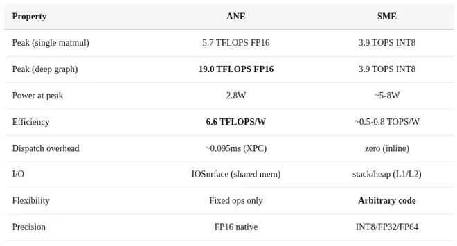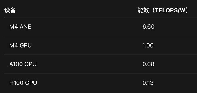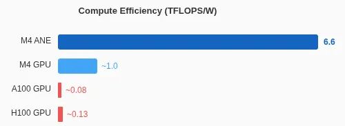 ANE最引人注目的特性是其卓越的能效比,即使在峰值负载下也能实现6.6 TFLOPS/瓦的效率。这远远领先于传统GPU,使其成为移动设备中的首选硬件加速器。