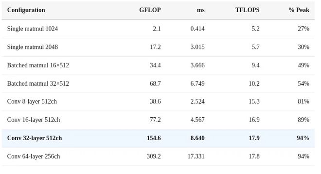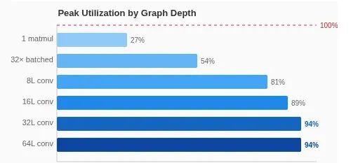 在32层以上的深度网络中达到94%的利用率,意味着几乎测量了硬件的原始极限能力。