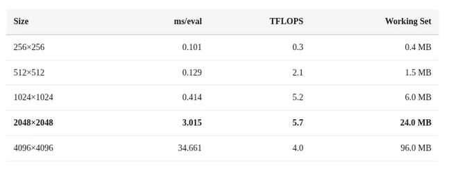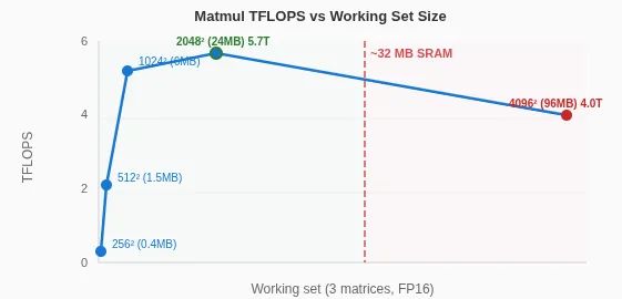 当尺寸为2048×2048时,24 MB的计算集完全适配芯片上的SRAM,因此能达到峰值单次运算吞吐量(5.7 TFLOPS)。