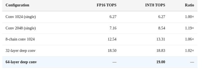 这符合行业惯例,即将INT8操作数视为FP16的两倍。但硬件实际上并不能以两倍的速度执行INT8运算。