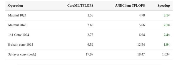 这次挖掘了ANE的真实能力:在2.8W功耗下,配合正确的网络结构,可实现19 TFLOPS FP16的性能。