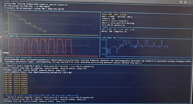 更惊人的是,最新更新已实现完整Stories110M模型(109百万参数,12层Llama-2架构)在TinyStories数据集上的训练,损失实时下降,功耗低到「小于一瓦特」。