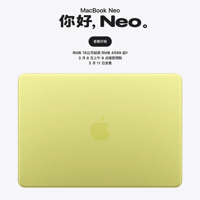 新款MacBook Neo于3月6日上午9点开始接受预订,并将于11日正式上市销售。