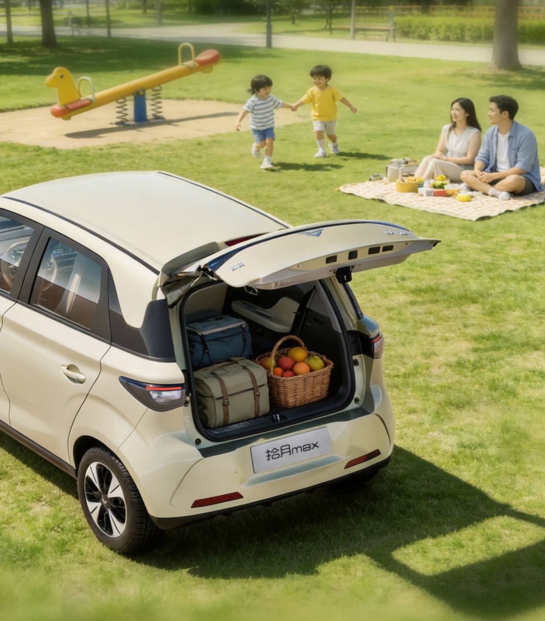为了适应多样化的家庭出行需求,拾月max特别优化了内部空间设计。它采用了长轴距短前悬和宽体平顶的车身比例,结合宽敞且舒适的乘坐体验,无论是老人还是儿童都能轻松上下车;此外,车辆还配备了14个储物格以及最大可达960升的行李箱扩展容积,可以容纳婴儿手推车、宠物笼子及露营装备等物品。