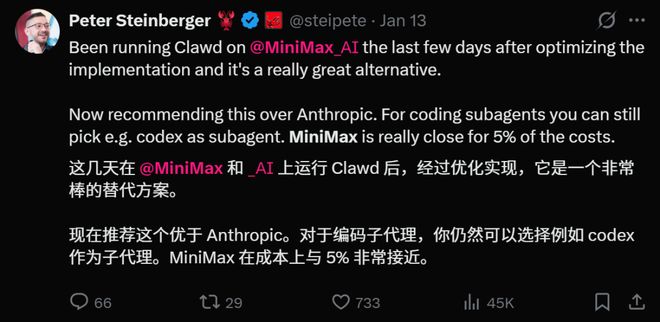 无独有偶,OpenClaw创始人Peter,也曾连发五条推文公开称赞MiniMax是最好的开源模型。