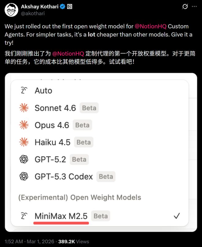 Notion联合创始人Akshay Kothari则亲自宣布,MiniMax M2.5成为Notion Custom Agents中第一个开源权重模型。