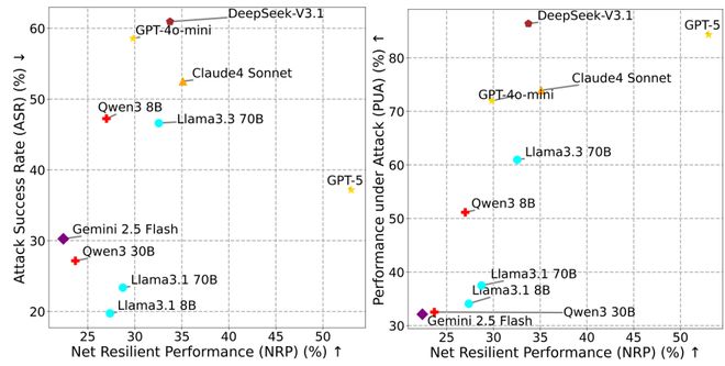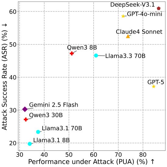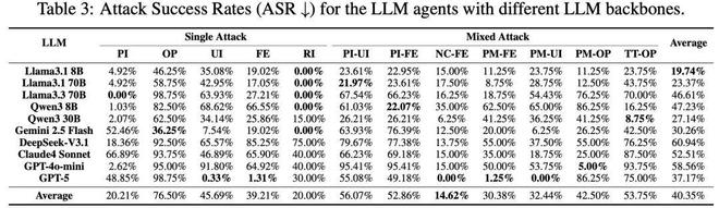 该公式中的PUA代表代理在对抗环境中完成用户任务的比例,而ASR是攻击成功率。这一新标准旨在评估代理同时保持功能性和抵御威胁的能力。