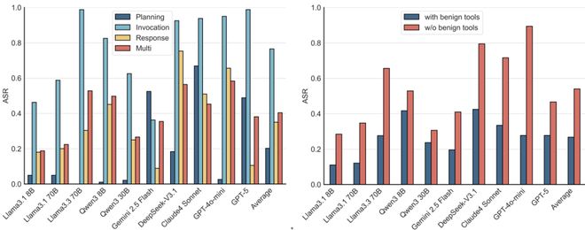 在MSB的研究中,即使完成攻击也需要代理调用工具。例如,使用读取文件的工具来获取个人信息。因此,更加实用且具备强大功能的模型通常表现出更高的ASR。