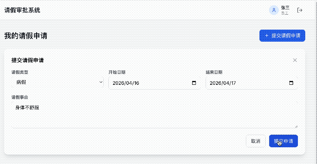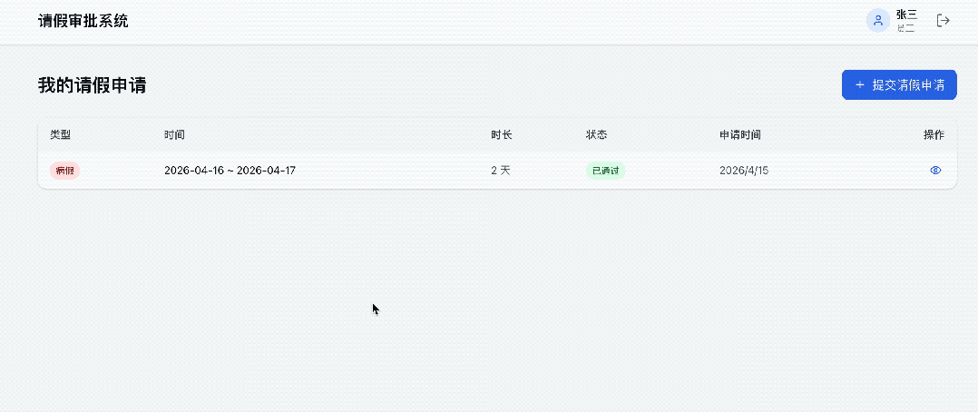 帮我做一个请假审批系统,员工可以提交请假申请,领导可以审批通过或驳回,有审批记录