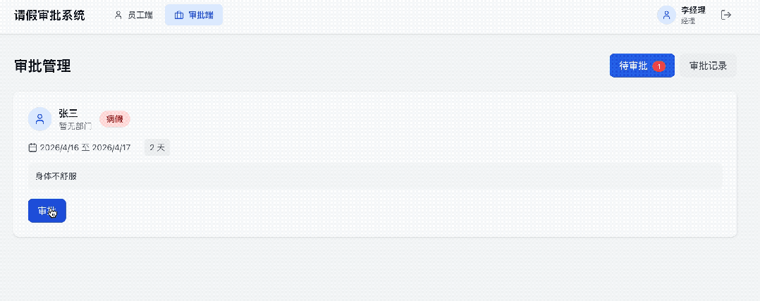 再登录经理账号来看一下,经理这边的审批端能看到员工提交的请假申请,选择同意或者驳回,审批后的记录也能查看。