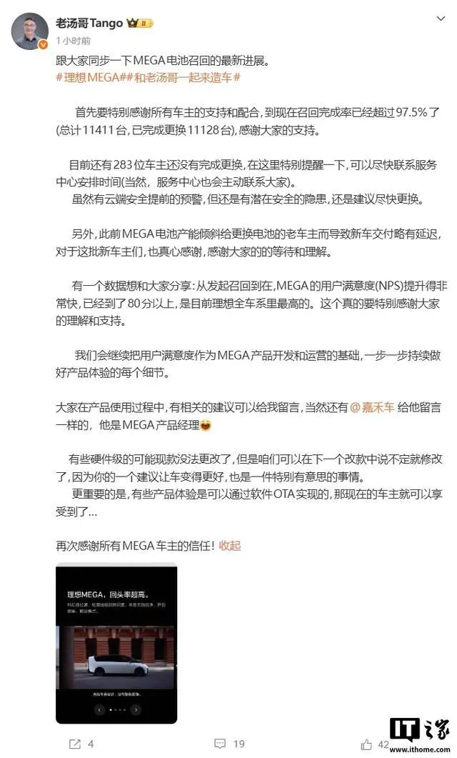 3月15日,理想汽车的产品线负责人汤靖披露了关于MEGA电池召回的最新情况。到目前为止,召回完成率已超过97.5%,涉及11411台车辆,其中11128台已成功更换。目前仍有283位车主未完成更换。汤靖建议车主尽快完成更换,以消除潜在的安全隐患,尽管此前已经通过云端预警系统提前发出警告。