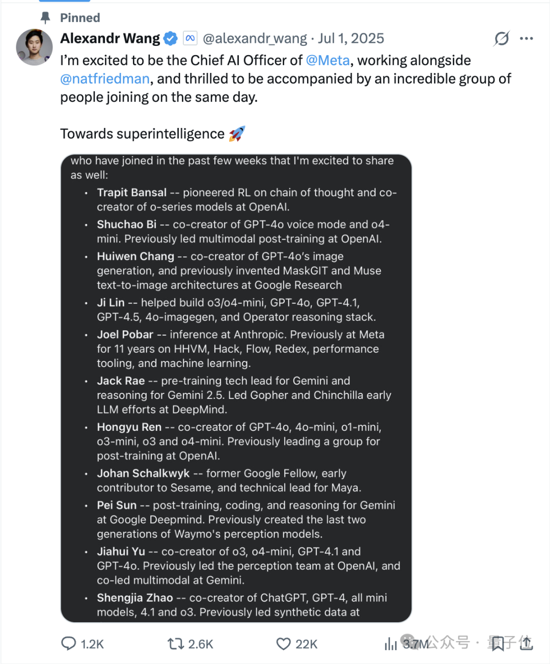 同时王卸任CEO职务,正式加入Meta担任首席AI官,负责新成立的Meta超级智能实验室(MSL)。