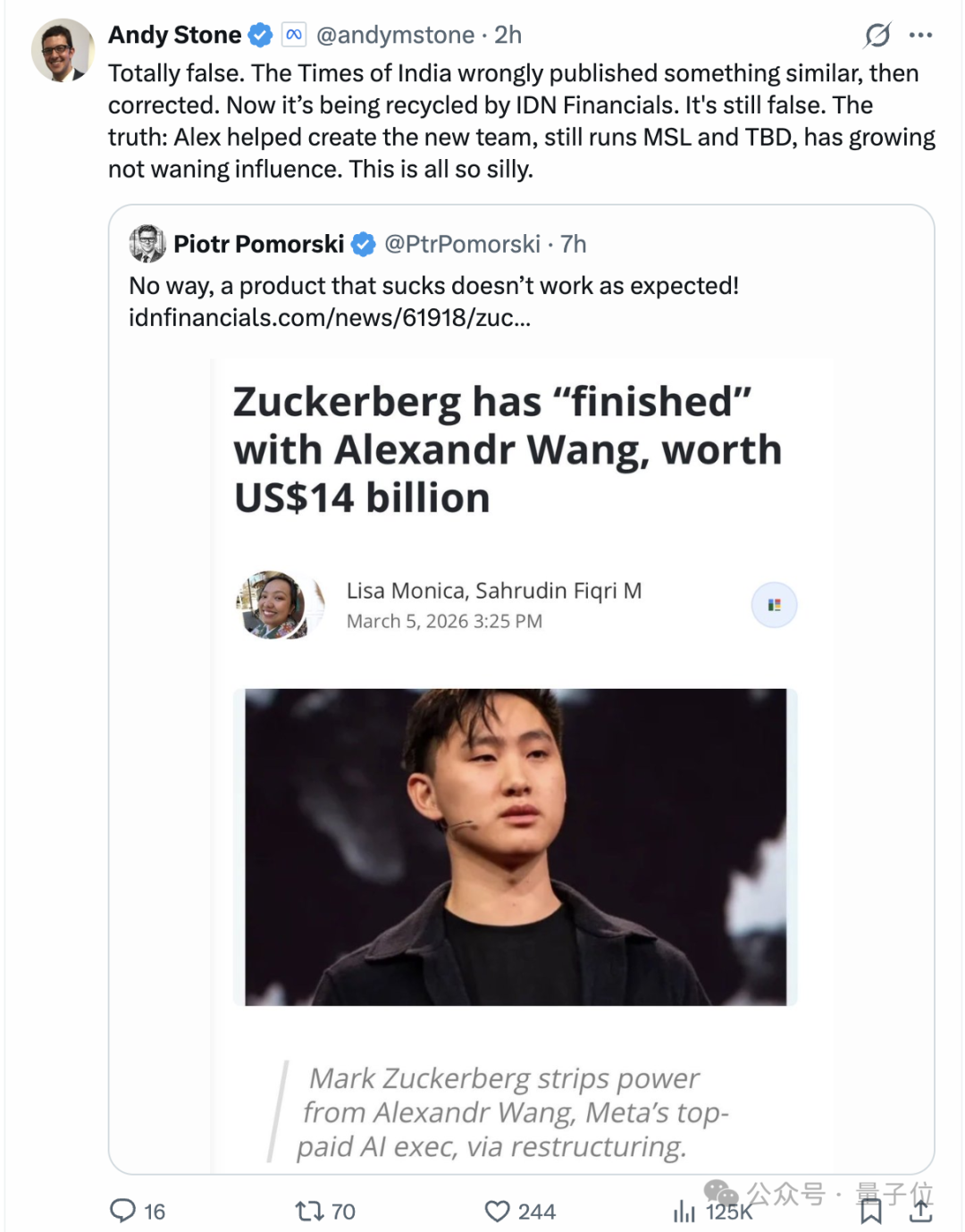 随后不久,Meta的一位发言人Andy Stone也在X平台上发表声明,澄清最近关于“亚历山大·王离职”的传闻是不实信息。