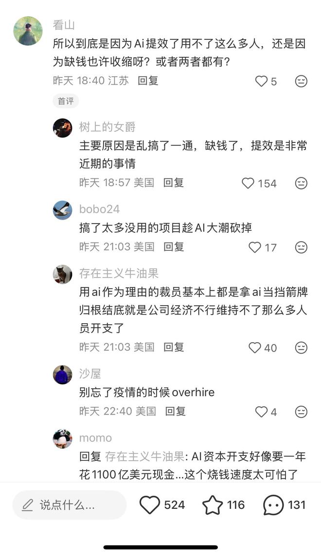 小红书上有网友指出,Meta裁员的主要原因是因为资金紧张,并试图提高效率。也有人感叹,Meta在AI上的花费每年高达1100亿美元,这样的烧钱速度令人担忧。