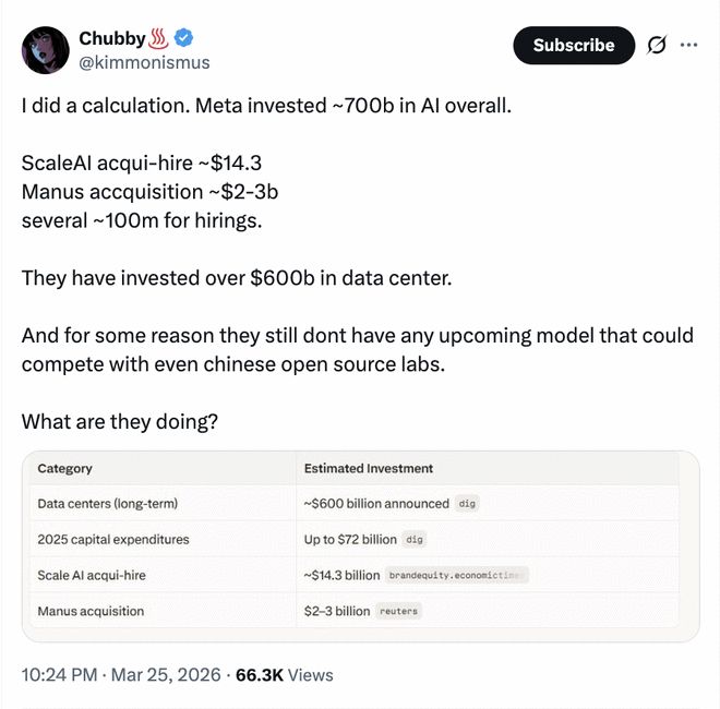 根据X平台上的用户估算,Meta在AI领域已投资约7000亿美元,包括数据中心建设、收购Scale AI和Manus等。