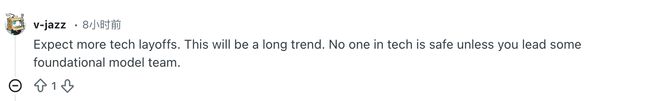 更扎心的评论来自v-jazz:“预计会有更多的科技公司裁员。这是一个长期的趋势。在科技圈,除非你领导着某个基础模型团队,否则没人是安全的。”