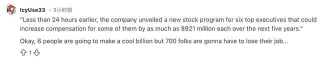 一位名为IcyUse33的网友讽刺道:“不到24小时前,公司公布了针对六名高管的新股票计划,这可能使他们在未来五年内每人的薪酬增加高达9.21亿美元。好极了,六个人要成为亿万富翁了,而七百个人却要失业。”
