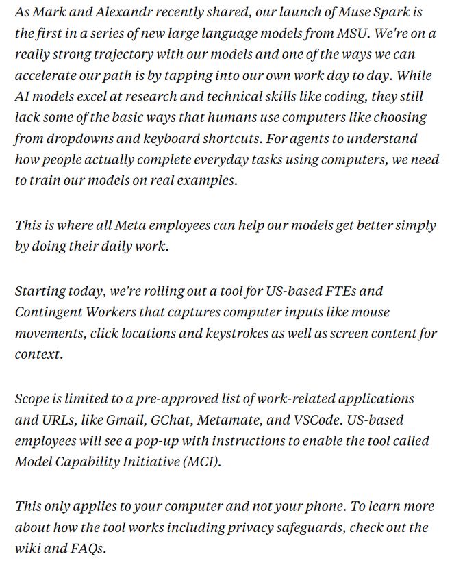 据路透社报道,Meta正在美国工作电脑上推行名为“模型能力计划”(MCI)的监控软件,该软件能够实时捕捉员工的操作数据,包括鼠标移动路径、点击位置及键盘输入内容,并定期截取屏幕画面。这些信息将被用于AI训练。
