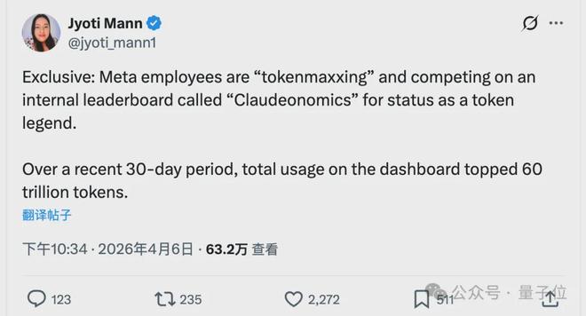 因此,在这样的背景下,Meta内部约有85000名员工为了争夺“Token Legend”等荣誉头衔而展开激烈竞争,直接将算力消耗量视为衡量职场地位的新标准。
