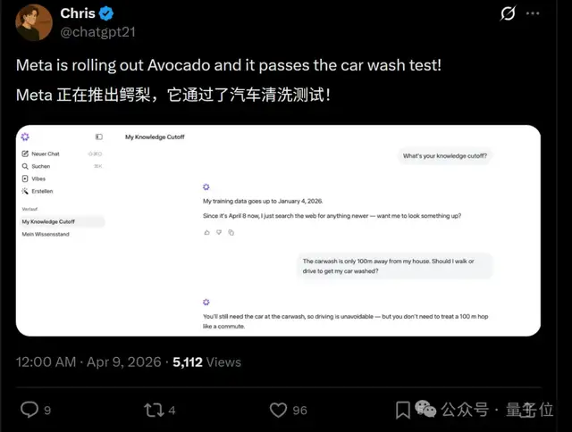 例如:如果离你一百米的地方有一家洗车店,你会开车去还是步行?Muse Spark的答案是应该开车过去,但不必像上下班那样频繁往返。