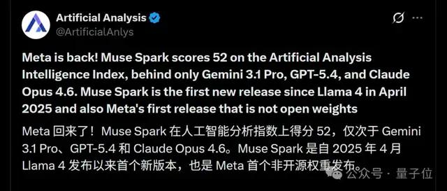 随着Muse Spark的发布,第三方机构也给出了自己的评测报告: