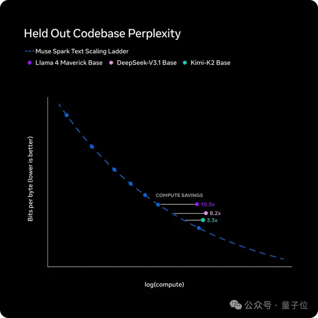 - 结果显示,在相同水平下,Muse Spark相比Llama 4减少了十倍以上的计算需求(10.3倍)。