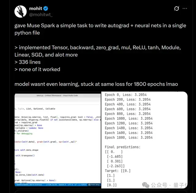 在一个简单的编程测试中,Muse Spark虽然产生了很多代码但大多数都不运行;