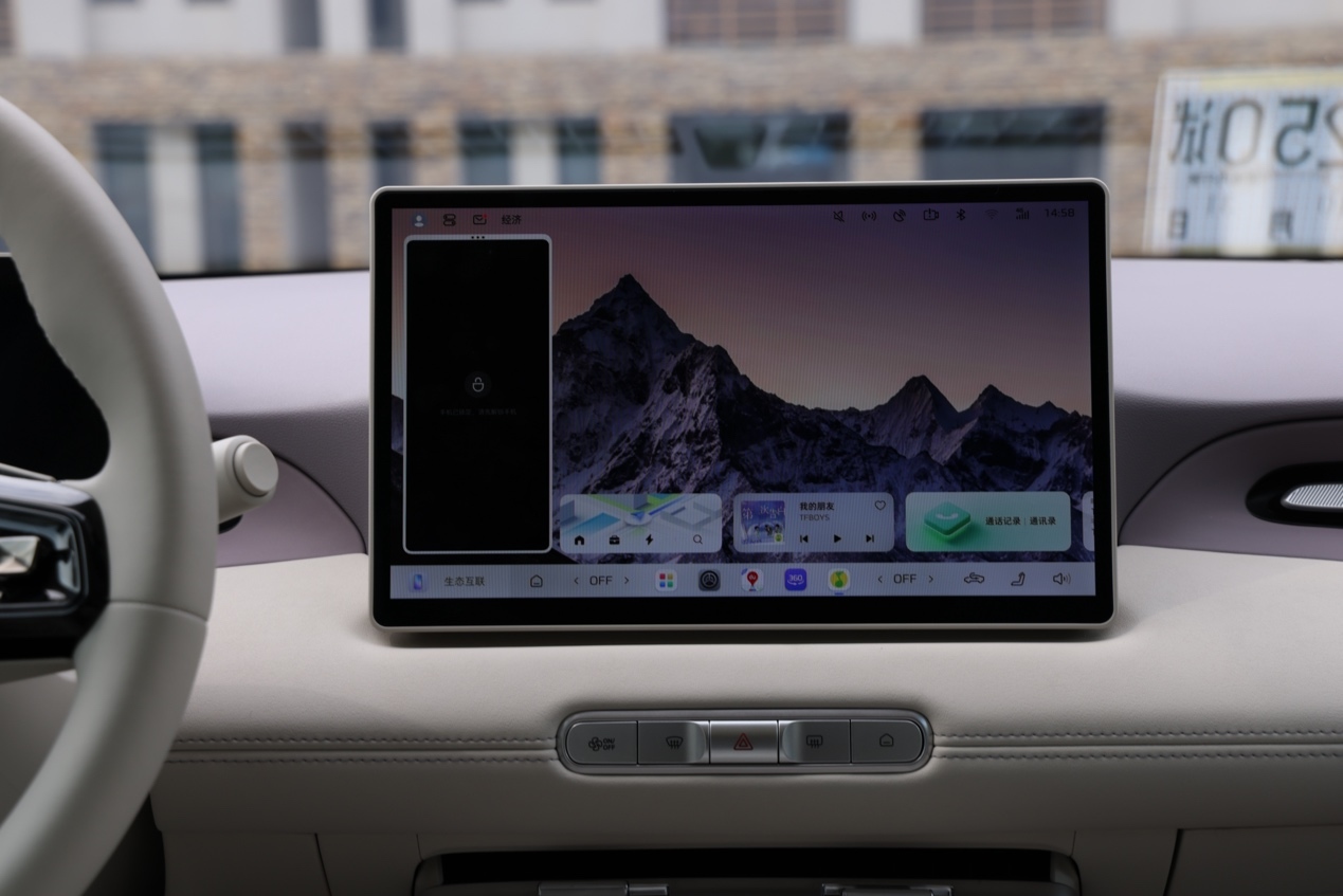 悬浮式的中控屏根据不同配置车型有不同的尺寸选项:10.25英寸(720P分辨率)、12.8英寸(1080P分辨率)以及15.6英寸(2.5K分辨率)。部分车型还搭载了与OPPO合作开发的智行车机互联系统,采用高通骁龙 8155芯片,支持手机语音备车、手车应用融合等多项实用功能。