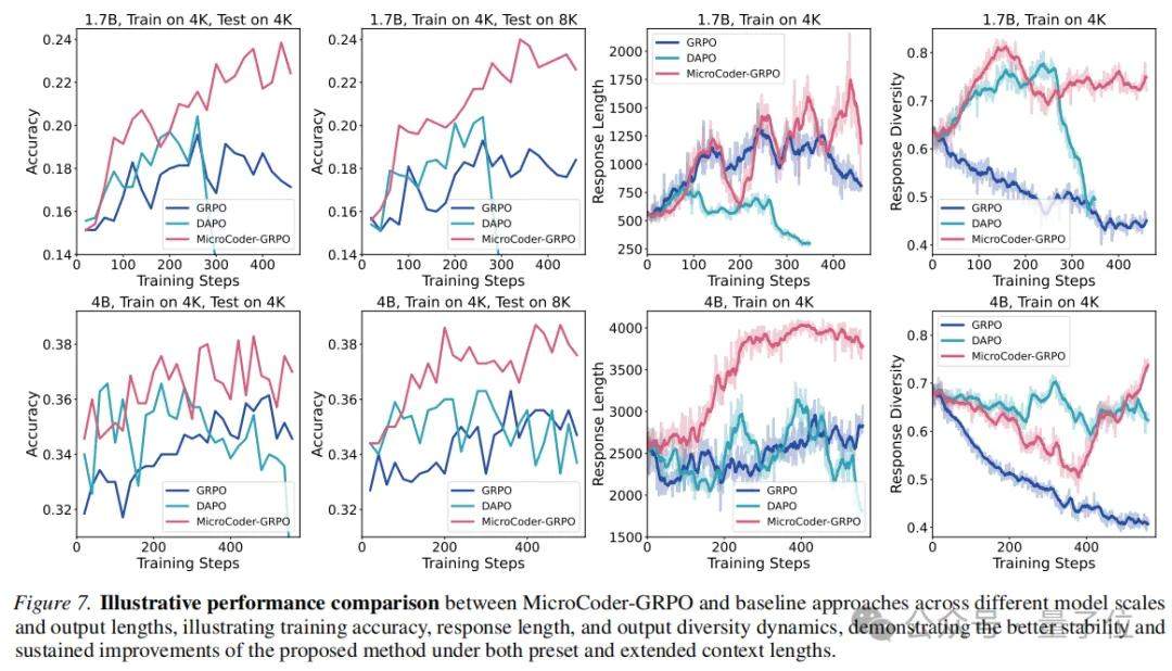 针对这一训练瓶颈,来自微软亚洲研究院、剑桥大学和普林斯顿大学的研究团队提出了MicroCoder项目,包含四个核心贡献:MicroCoder-GRPO算法、MicroCoder-Dataset数据集、MicroCoder-Evaluator训练评估框架,以及跨超过30组受控实验总结的34条训练经验。