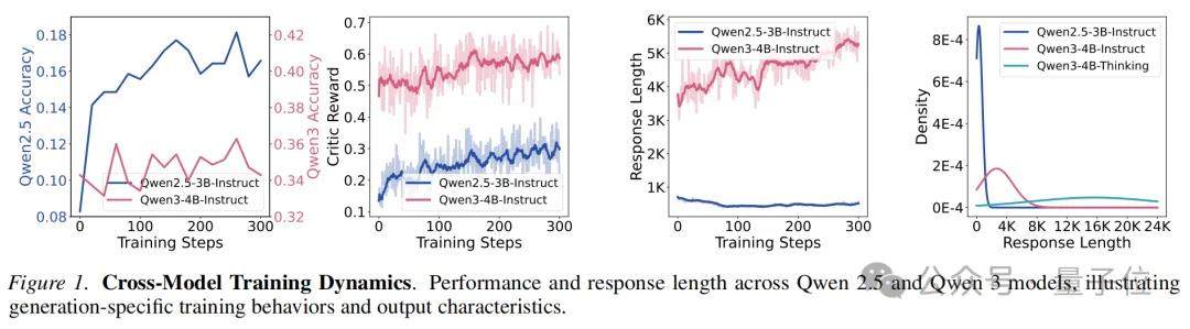 这背后的原因是代际性的:最新推理模型的能力已经超出了主流数据集的难度,这些题目对它而言过于简单,无法产生有效的学习。与此同时,最新推理模型在训练中输出长度持续增长,而旧模型的输出长度稳定甚至下降,两代模型的训练动态已经截然不同,专为旧模型设计的训练方法在新模型上不再适用。