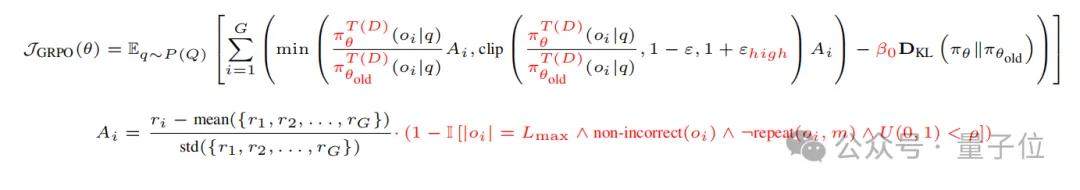 KL散度与裁剪比率:标准KL散度会持续影响输出多样性并限制输出长度增长,形成“性能先涨后跌”的形式。去除KL散度是支持长期持续性能提升的重要条件。