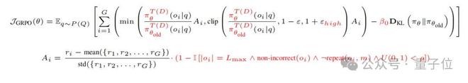 KL散度与裁剪比率:标准KL散度会持续影响输出多样性并限制输出长度增长,形成“性能先涨后跌”的形式。去除KL散度是支持长期持续性能提升的重要条件。
