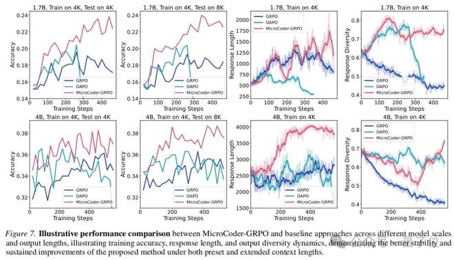 此外,通过优化并行处理策略,MicroCoder-Evaluator将每个训练步骤的执行速度提升约40%,显著提升了训练效率。