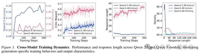 这背后的原因是代际性的:最新推理模型的能力已经超出了主流数据集的难度,这些题目对它而言过于简单,无法产生有效的学习。与此同时,最新推理模型在训练中输出长度持续增长,而旧模型的输出长度稳定甚至下降,两代模型的训练动态已经截然不同,专为旧模型设计的训练方法在新模型上不再适用。