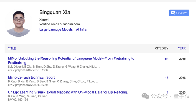 Bingquan Xia,中科院计算技术研究所的研究生,是MiMo-V2-Flash的核心开发者之一。
