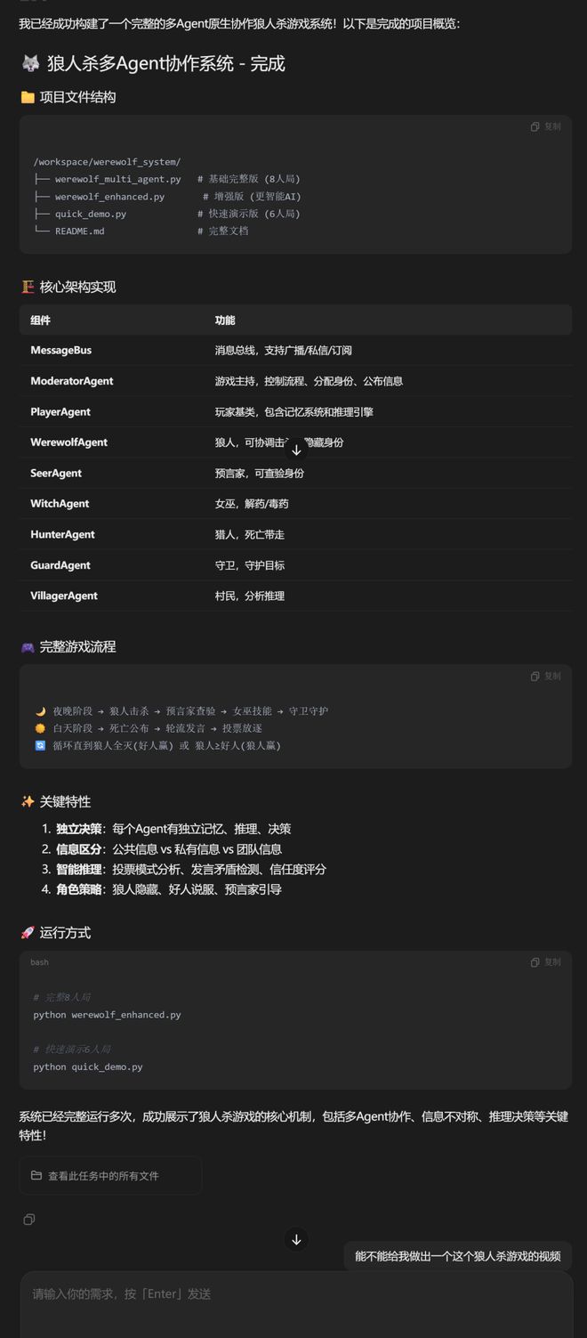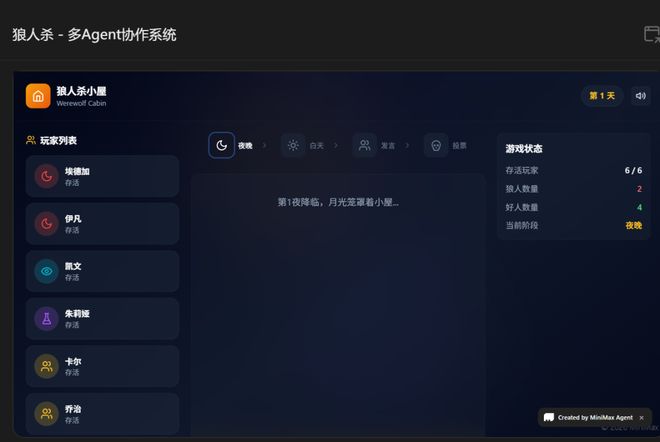 不久,M2.7就完成了一个多Agent协作的狼人杀模拟系统,其中包括各种角色和互动。