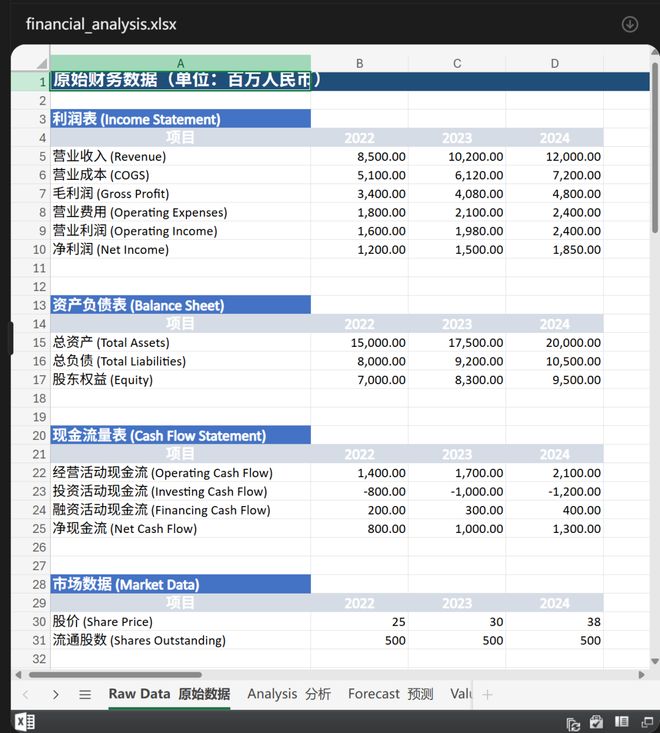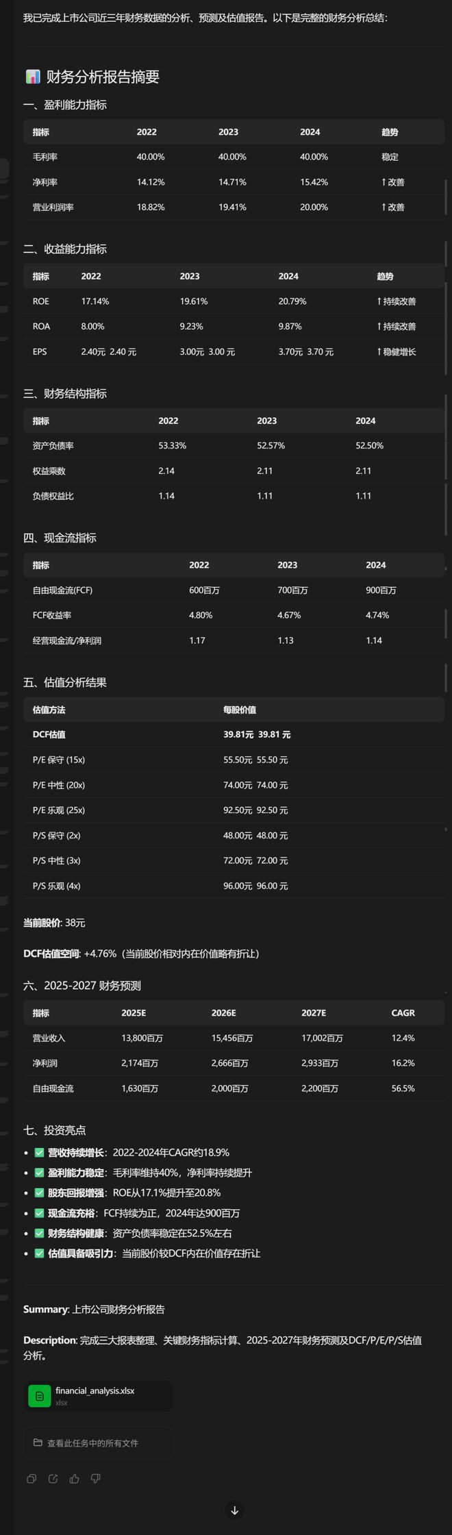 它迅速生成了一份详细的财务分析报告,包括盈利能力指标、收益能力指标、财务结构指标、现金流指标、估值分析结果,以及2025-2027的财务预测。