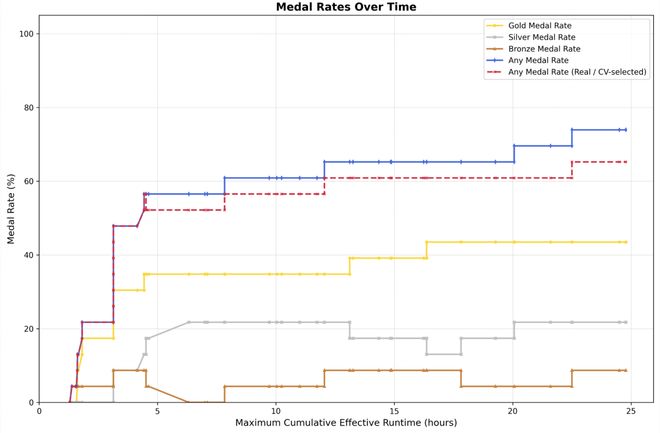 在三次24小时的独立实验中,M2.7的表现随时间持续提升。最佳成绩为9金、5银、1铜,三次平均得牌率为66.6%,与Gemini-3.1持平,仅次于Opus-4.6(75.7%)和GPT-5.4(71.2%)。