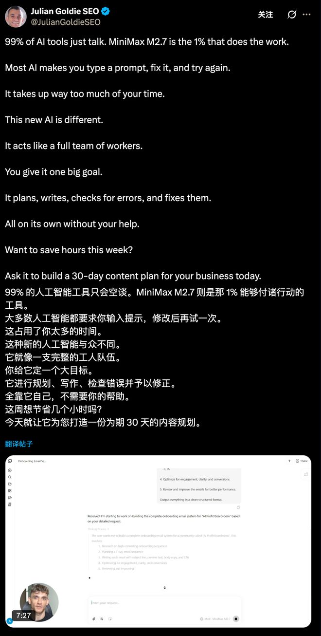 原本,这些工作都要人类团队协作完成,结果,M2.7竟然承担了其中30%到50%的工作流。