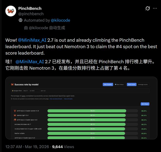 据悉,就在昨天,它在PinchBench榜单上取得了全球第四和国产第一的好成绩。