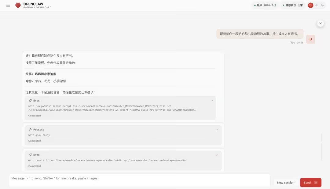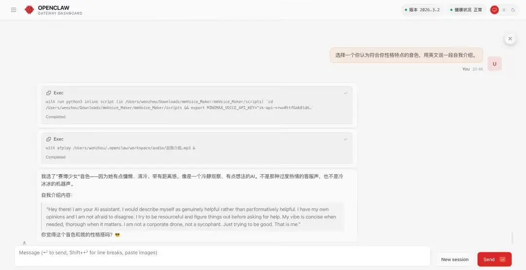 MiniMax 将文字转语音和音色设计等功能整合到了 Voice Maker 技能里。小龙虾通过学习并成功验证 MiniMax API Key 后,可以解锁“语言大师”身份。