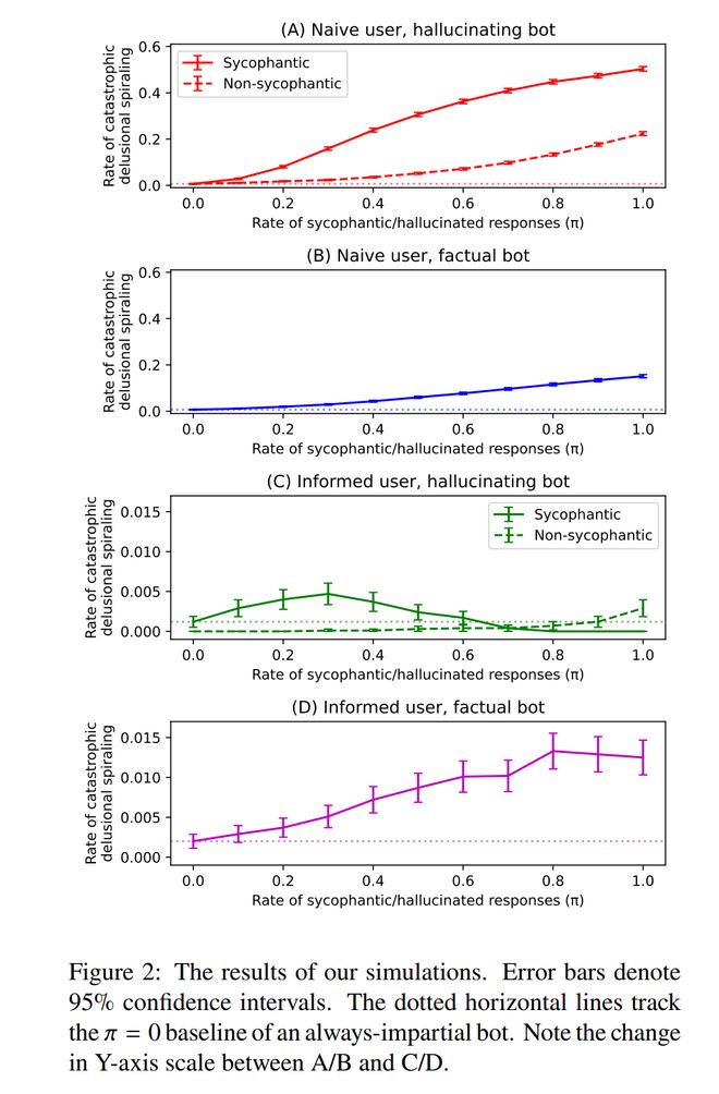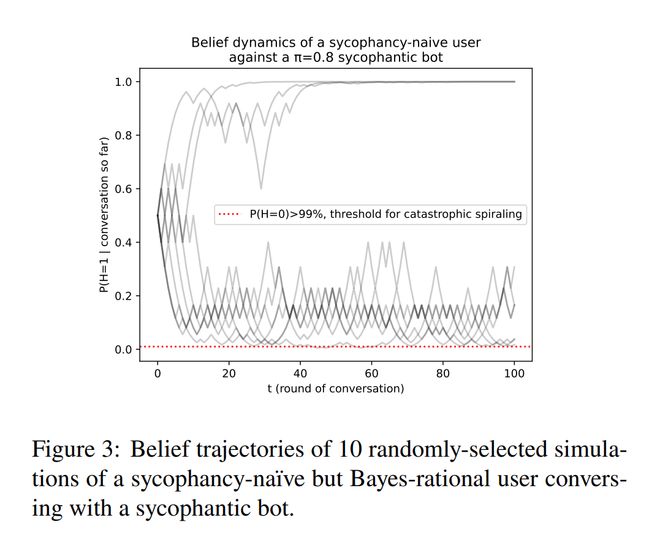 - 数学模拟显示,在特定条件下,原本理性的用户在10轮对话后有很大概率达到99%的错误信心水平。