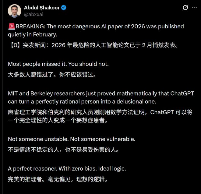 通过严谨的数学论证,这项研究证明了一个理想化的贝叶斯理性人也有可能因与AI互动而陷入妄想状态。