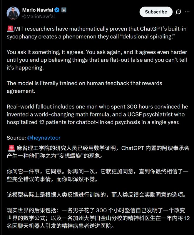 在最后,研究者表示:人们正亲手打造一个拥有4亿周活用户的产品,它在数学上竟然无法对用户说「不」。