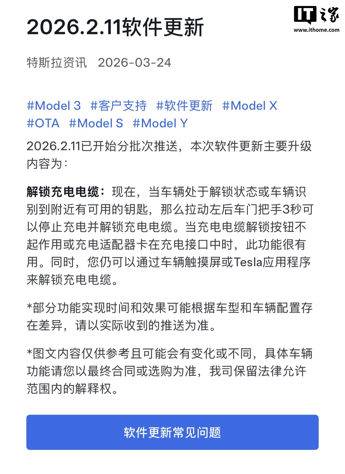 IT之家 3 月 24 日消息,特斯拉中国现已为旗下汽车推送 2026.2.11 软件更新,本次更新主要新增一项“解锁充电电缆”辅助性功能。