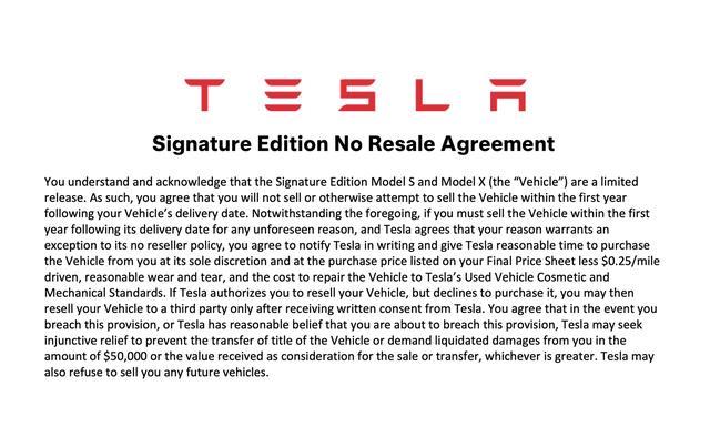 一份由Not A Tesla App曝光的订单文件揭示,最后一批Model S Plaid和Model X Plaid特别版车主必须签署一项严格的禁止转让协议。该协议要求车主在车辆交付后的首年内不得出售或试图转售其车辆。一旦违反此规定,购车者将面临50,000美元(约合人民币34.2万元)的违约金赔偿,或是实际获利金额中的较高值。