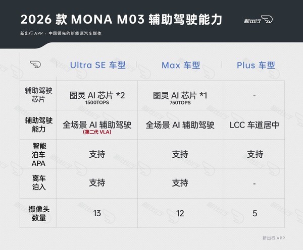 在辅助驾驶系统方面,2026款小鹏MONA M03简化为Plus、Max和Ultra SE三种型号,不同版本间的辅助驾驶能力有着明显的差异。其中,Ultra SE车型配备了全面的AI自动驾驶功能,并搭载了第二代VLA技术;而Max车型则装备了端到端的大模型系统,同样具备全场景下的辅助驾驶性能;相比之下,Plus车型仅提供LCC车道居中控制及智能停车功能。