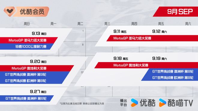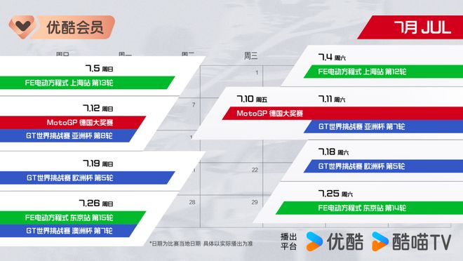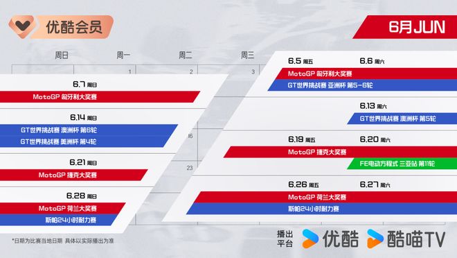 为了帮助观众更好地规划观赛时间,一份详细的「赛车观赛日历」已在优酷体育上线。邀请所有热爱速度与激情的朋友锁定频道,一同见证赛道上的激烈竞争、技术创新以及不屈精神,在每一次引擎轰鸣中释放自我热情!