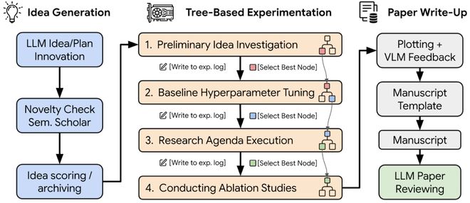 The AI Scientist的出现,则颠覆了这套「主仆叙事」,它完整覆盖了科研的四大核心阶段:Idea生成、实验迭代、论文写作、自动评审。